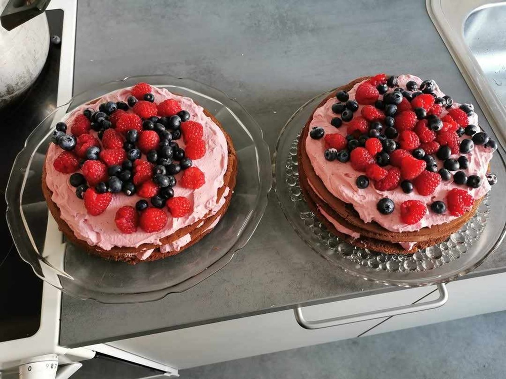 Lagkage med hindbærskum og bær