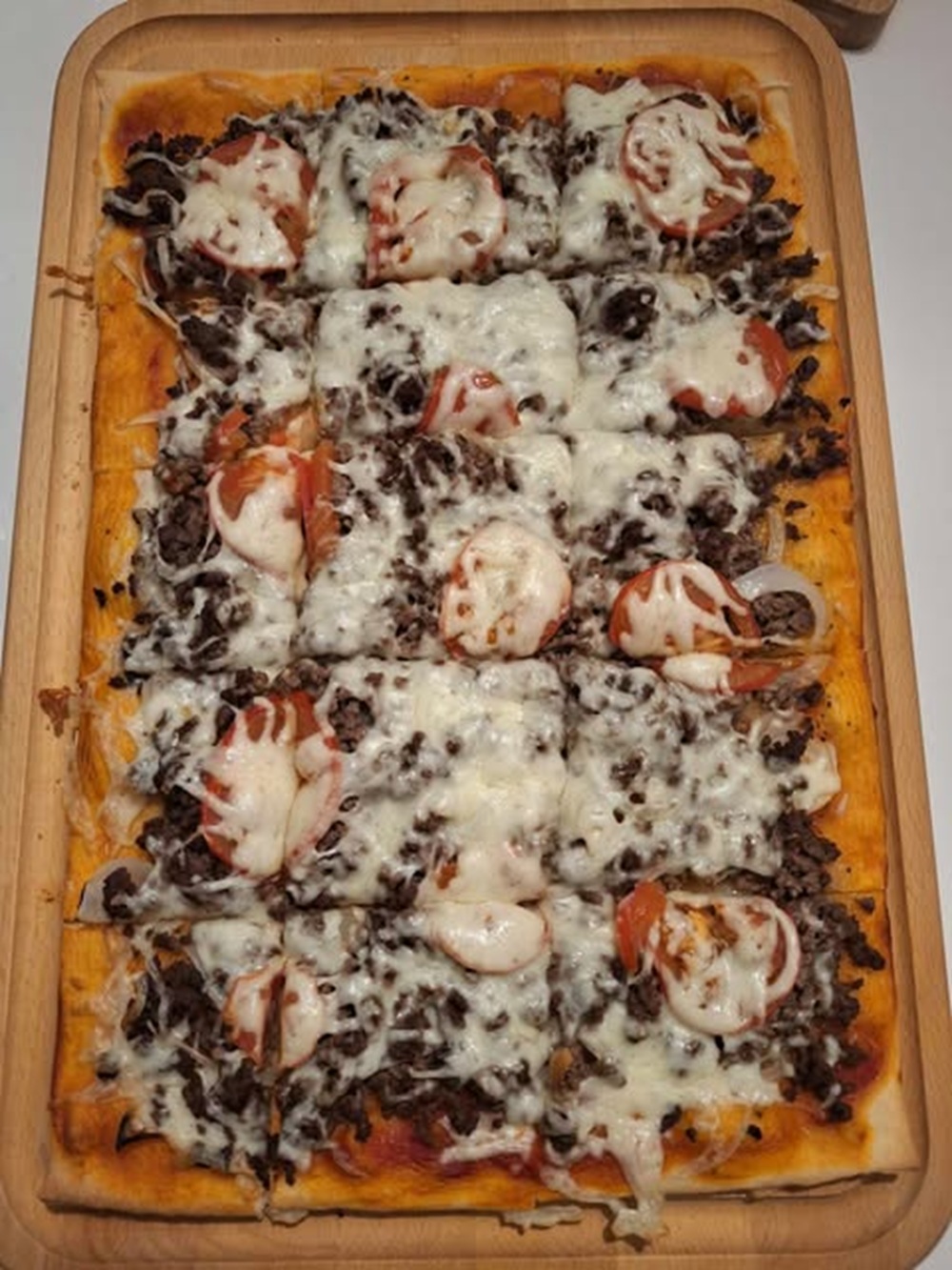 Pizza med kødsovs, løg og pepperoni